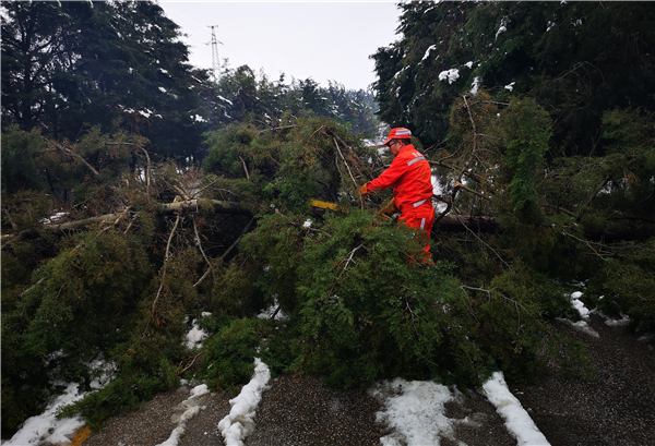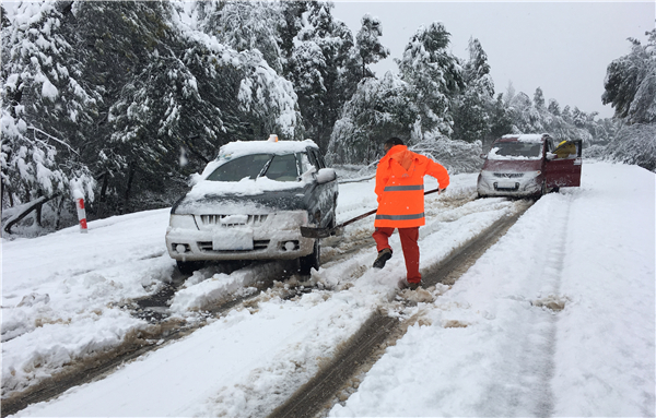 “小密枝监控杆这里阻断处的大树已经清开,积雪铲除,后面跟着的车辆现在已经在通行了!”在白雪皑皑的公路路面上,一个橘红色的身影一手持铲子一手拿电话第一时间通报公路保通情况。这是大年初一早上在九石阿公路上发生的一幕。这个身影就是昆明公路局石林公路分局石林公路管理所所长──严保存。