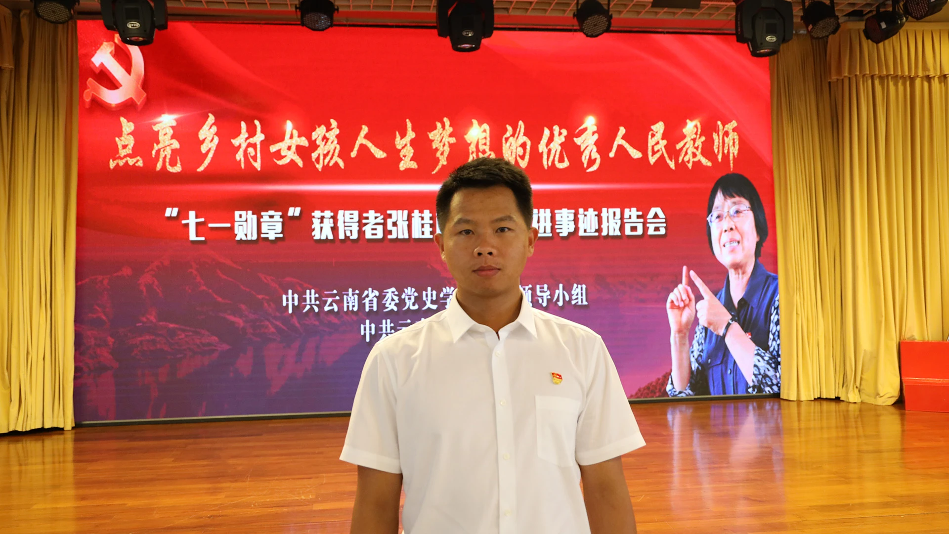 报告会在庄严的国歌声中开始。李向天以《用教育阻断贫困代际传递的忠诚实践者》为题,讲述了张桂梅创办免费女子高中的艰辛历程。他说:“从张桂梅老师身上,我看到了一名新时代人民教师不畏磨难的钢铁意志、无私无我追梦圆梦的蓬勃朝气,看到了新时代共产党员不忘初心、牢记使命的本色、本真。她是华坪的骄傲,也是我永远的榜样。”