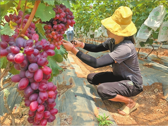 工人在果然好葡萄棚里修枝作业