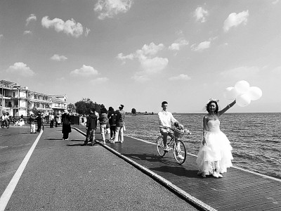 在海西段生态廊道,路两边湿地花草连绵不断,洱海水面波光粼粼,白族特色民居映入眼帘。生态廊道施工方指挥长杨成周解释说:“村庄旁的湿地叫雨水花园,底部铺有多层碎石、火山石、沙子等,上面种花卉植物,形成一个村庄污水净化系统,地表水经雨水花园净化后进入洱海,水质达到二类水。”