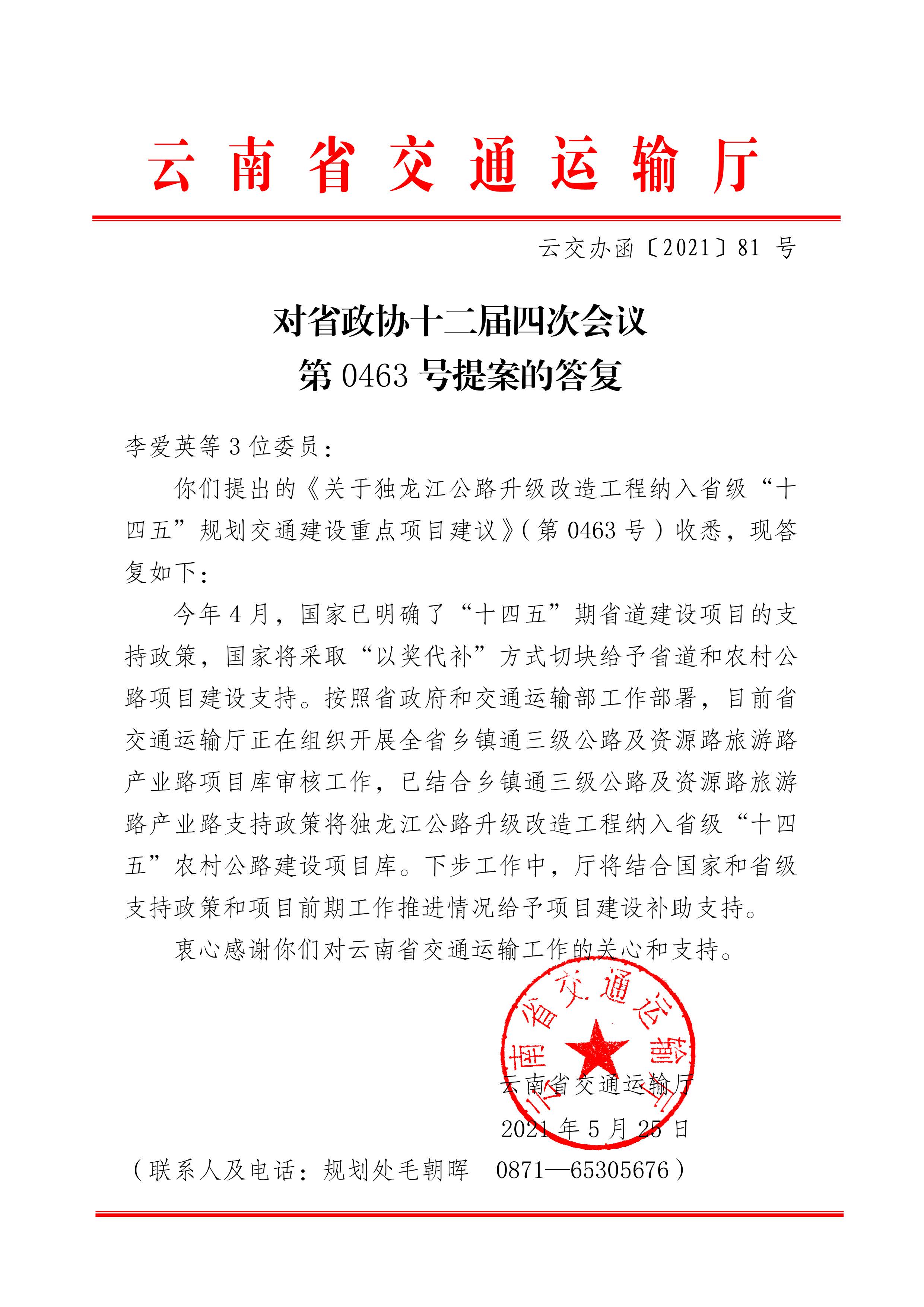 对政协云南省十二届四次会议第120400463 号提案的答复
