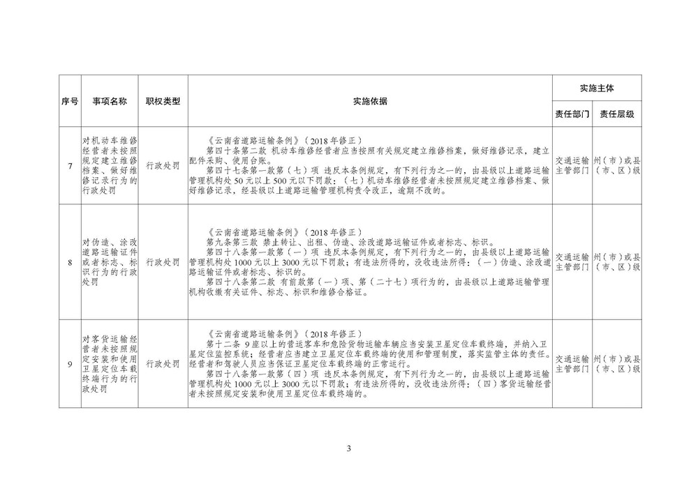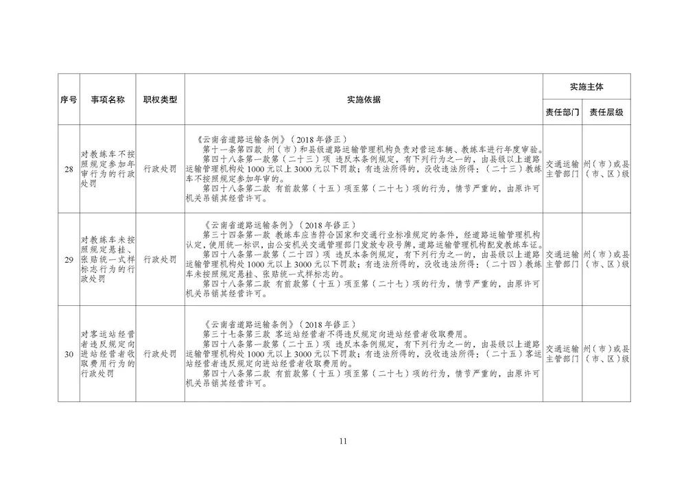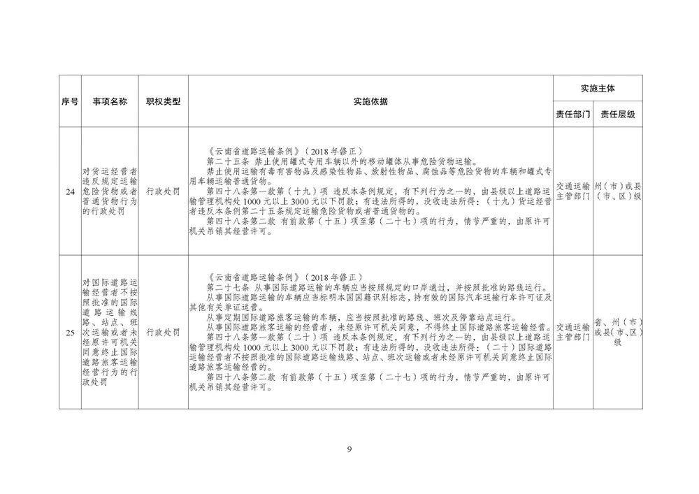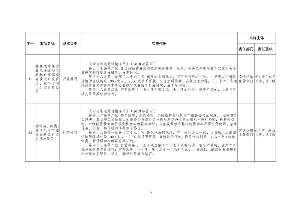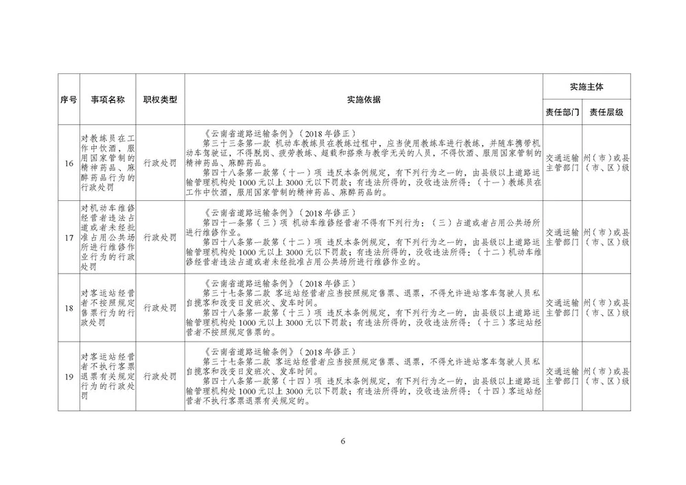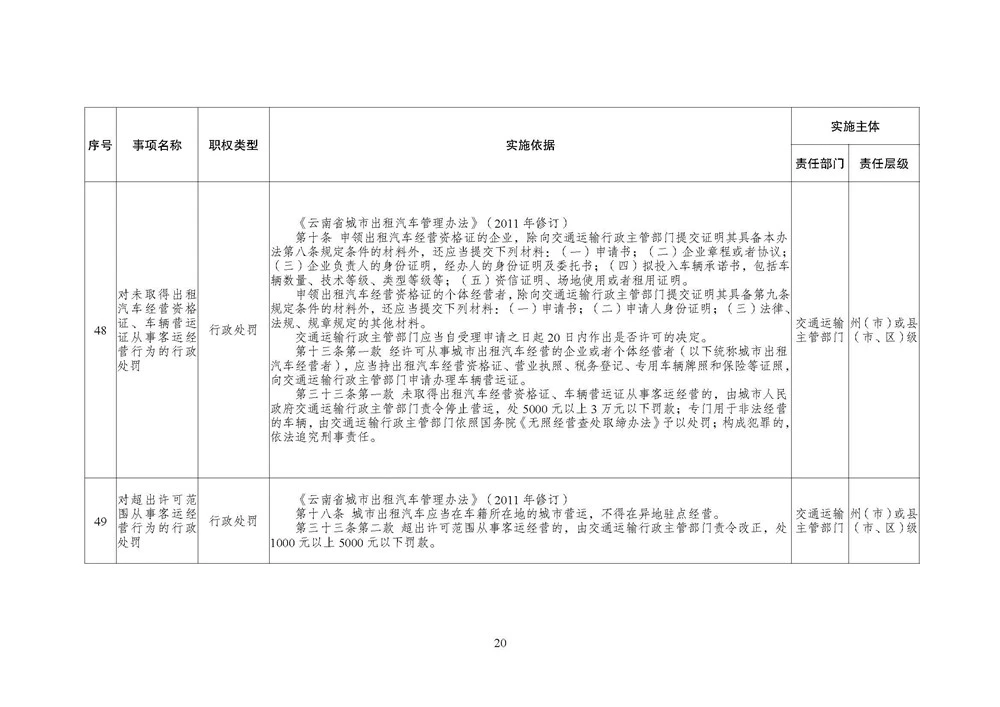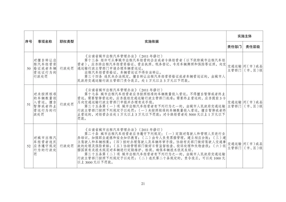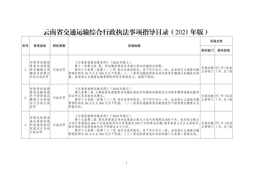 云南省交通运输综合行政执法事项指导目录(2021年版)