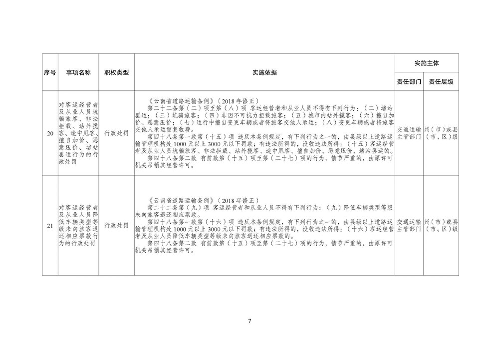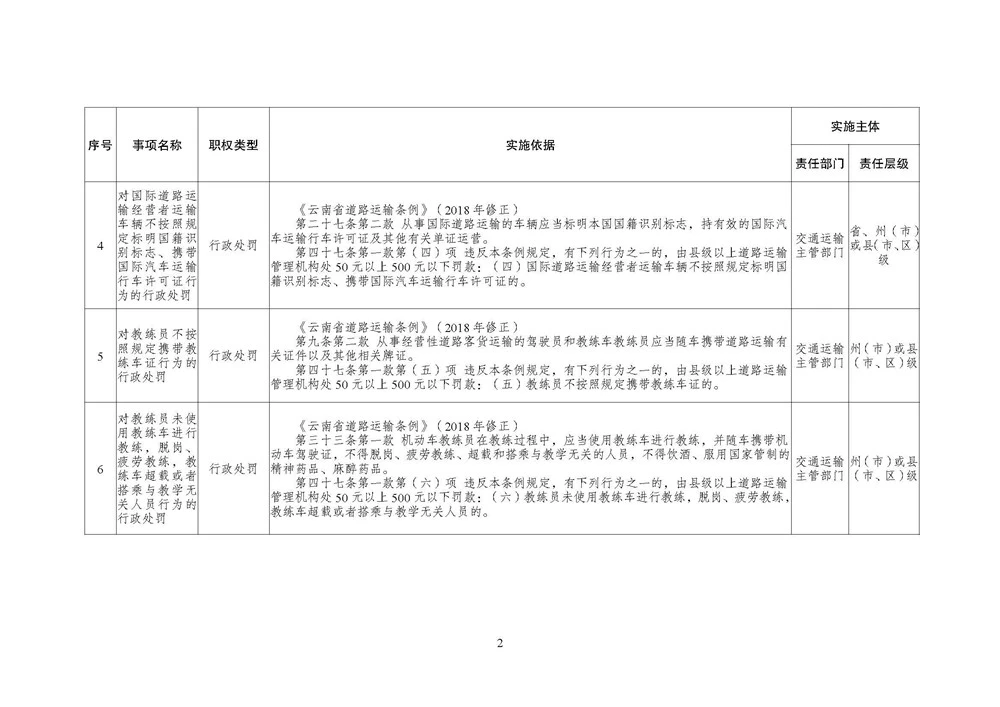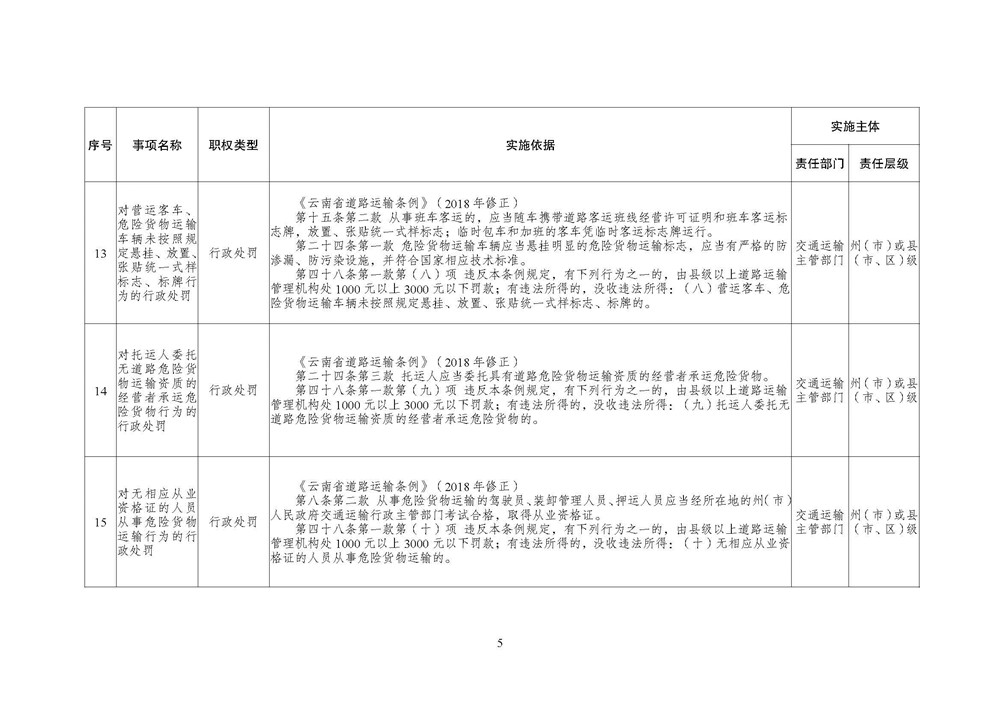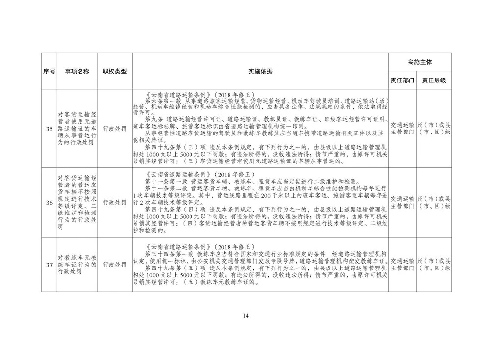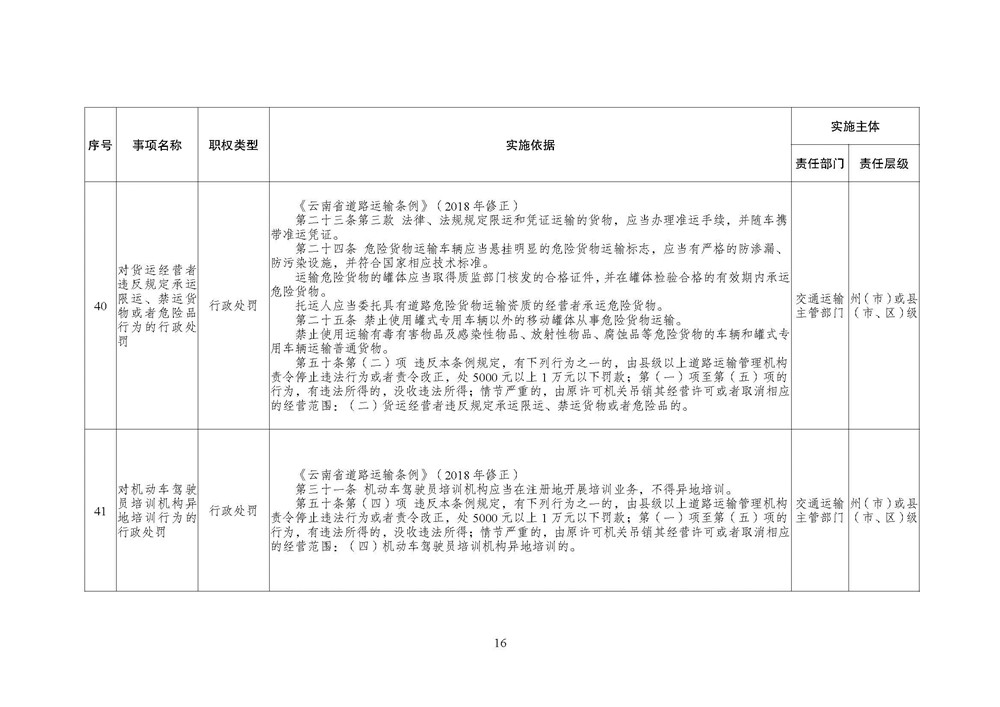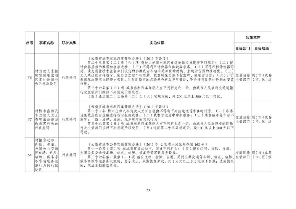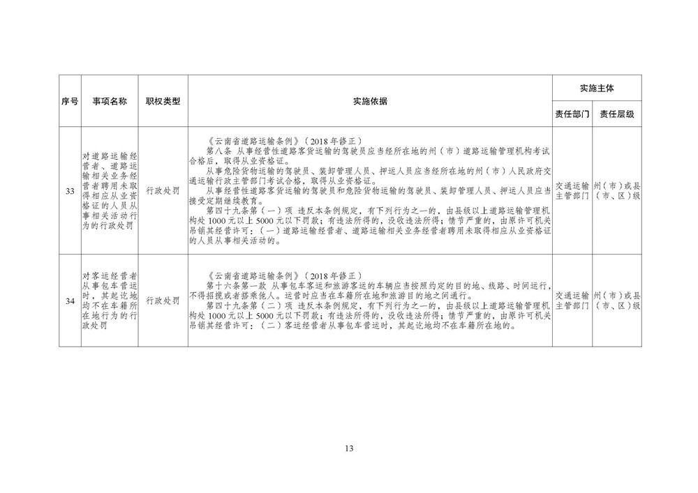 云南省交通运输综合行政执法事项指导目录(2021年版)