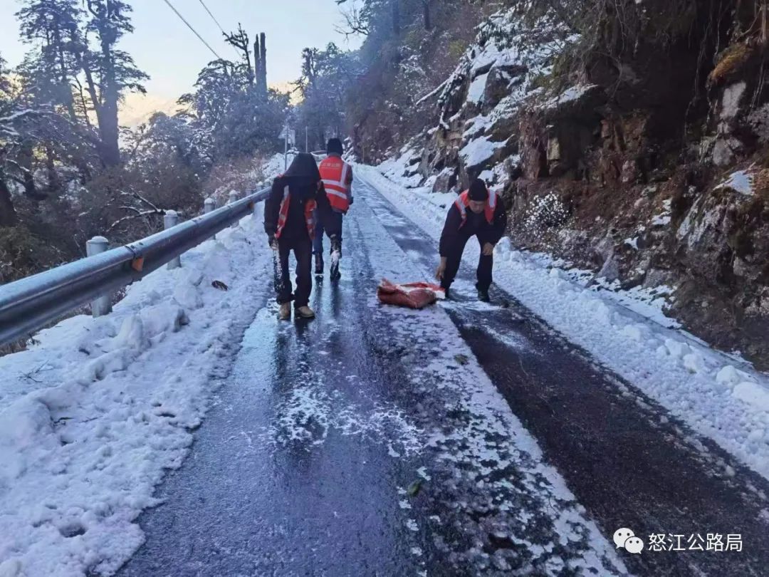 近期,贡山县境内大范围降温、强降雨雪天气,贡山公路分局管养的省道S318云岭-独龙江公路高海拔路段产生积雪、结冰的情况,导致过往车辆通行不畅,为全力确保管养道路安全、畅通,贡山公路分局以除冰雪为令,迅速启动应急保通预案,及时派出保通人员、机械设备及物资等,从道路两端赶赴积雪、结冰路段开展保畅通工作。