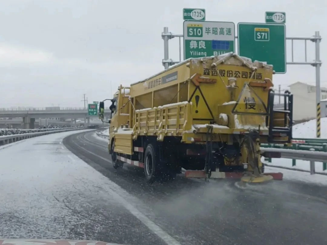 “人员、物资、机械已全部准备就位,准备撒布融雪剂!”