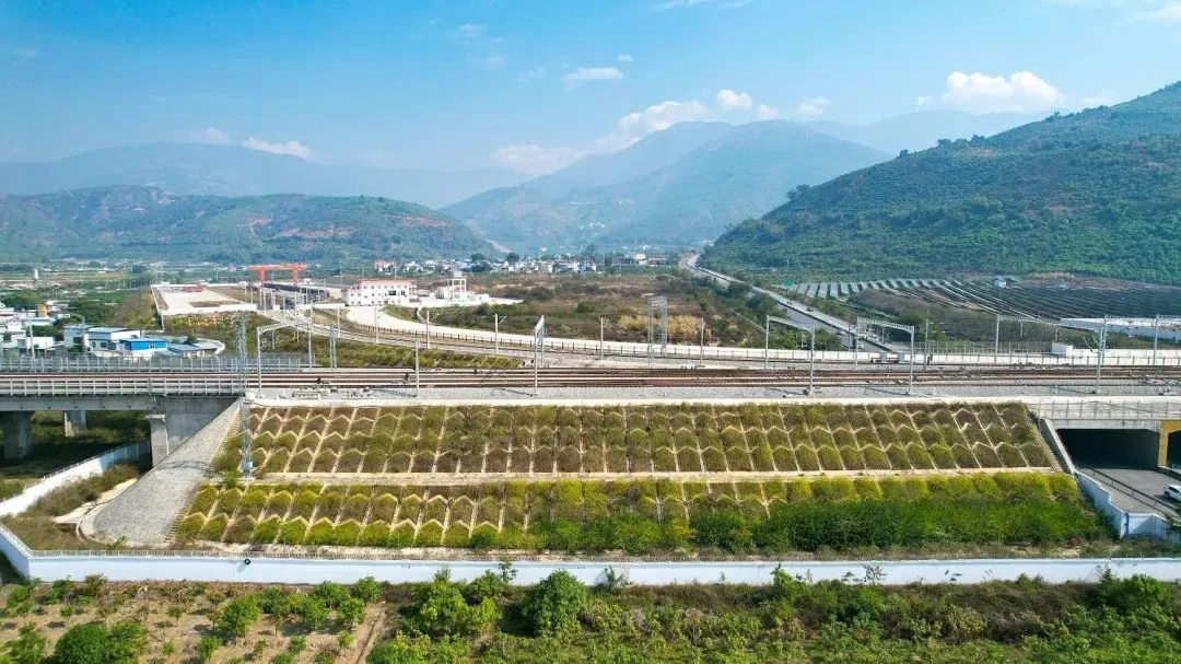 中老铁路沿途山岭重丘多,穿越磨盘山高海拔亚热带气候、哀牢山干热河谷气候、无量山热带雨林气候,气候湿润但雨量分配不均,铁路边坡区域裸露大光照强、土壤贫瘠保水能力低,养护难度极大。