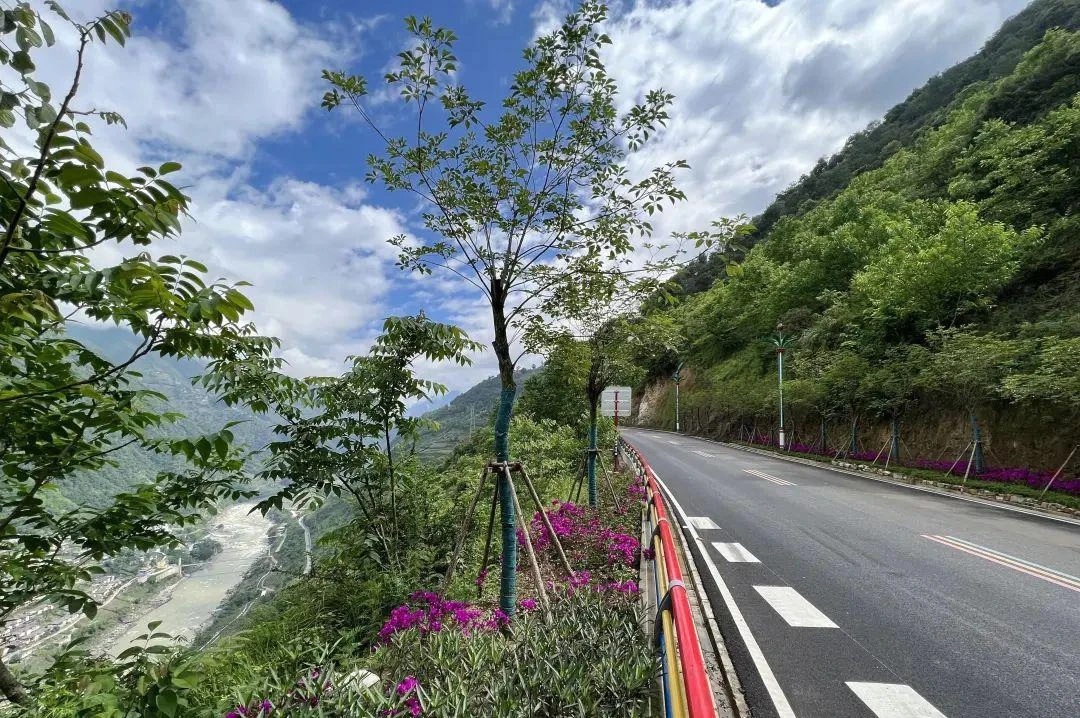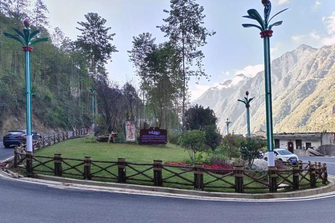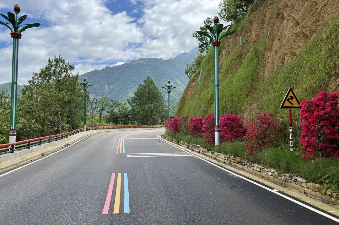 匹知公路共设置 256 个弯道,其中回头弯 18 个,通过对回头弯的视距安全整治、绿化景观小品建设,每个回头弯都成为一个小游园,实现了让回家的路成为一次穿越公园的旅行,全线设置 15 个停车带、7 个观景台、282 盏草果灯、回头弯 18 处景观绿化,路侧绿化 2016平方米。