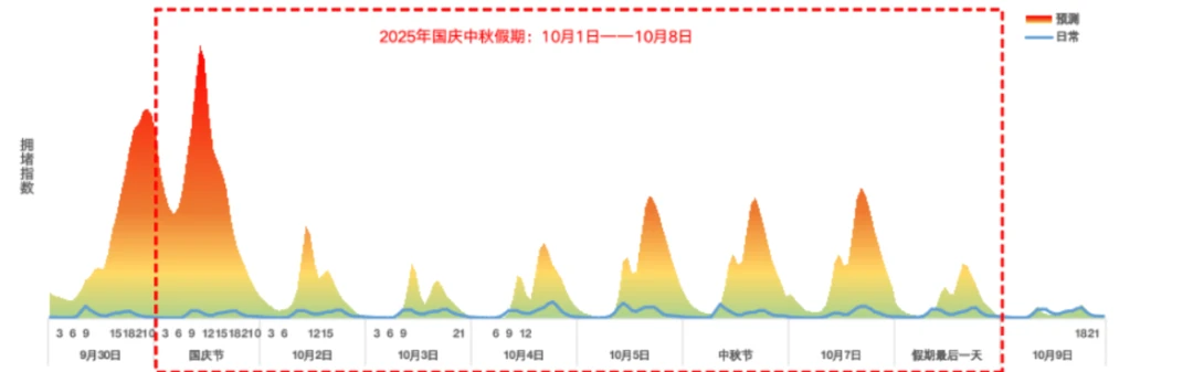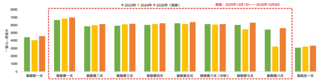 今年国庆中秋假期重叠,预计公众公路出行意愿强烈,路网整体高位运行。预计全国高速公路日均流量超6200万辆,较2024年同期日均增长2.4%。假期首日(10月1日),出行需求集中释放,高速公路网流量预计将接近或达到7000万辆,约为日常流量的2.1倍,为假期峰值。如图1所示。