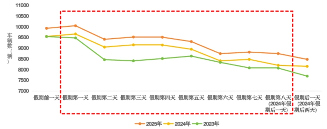 预计普通公路日均断面交通量超9000辆,较2024年同期日均增长约3%。假期第一日(10月1日)断面交通量达到峰值,超1万辆,之后整体呈下降趋势。如图2所示。