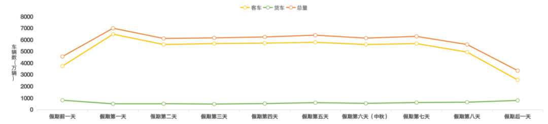 国庆中秋假期是下半年最长假期,也是年度最后一个假期,预计探亲流与旅游客流叠加,公路跨省、跨区域长距离出行明显增加。客车流量假期第一天和第五天有两个高峰;货车流量整体呈上升趋势,首日和中秋节当天为流量低点,如图3所示。预计国庆中秋假期全国高速小客车日均流量约5650万辆,占总流量比例近九成,自驾出行比例较高。