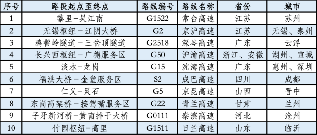 假期期间,全国高速公路预计易发生拥堵缓行的路段,如表1所示。