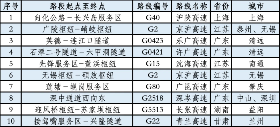 ▼表1-2国庆中秋假期返程全国繁忙易拥堵高速路段