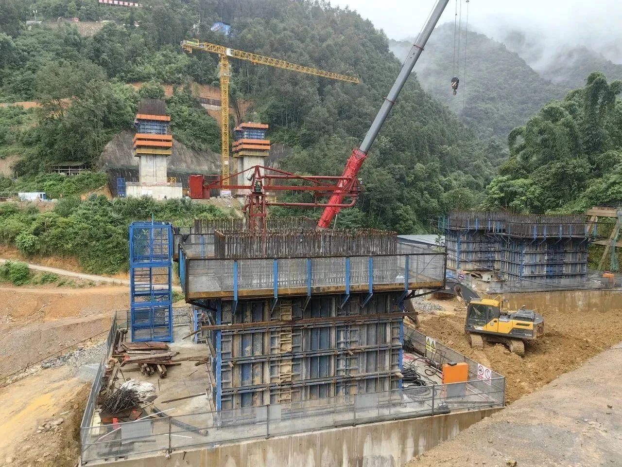 作为瑞孟高速的关键控制性工程,芒市北互通主线3号大桥总长达951米,主桥采用70+130+70米连续刚构设计,引桥运用预应力现浇箱梁与预制T梁相结合的施工工艺,4个主墩采用双肢薄壁空心结构,最高墩高逾80米,施工精度要求极高。截至目前,小里程左右幅主墩已各完成4.5米浇筑,大里程左右幅主墩推进高效,各完成18米浇筑任务。