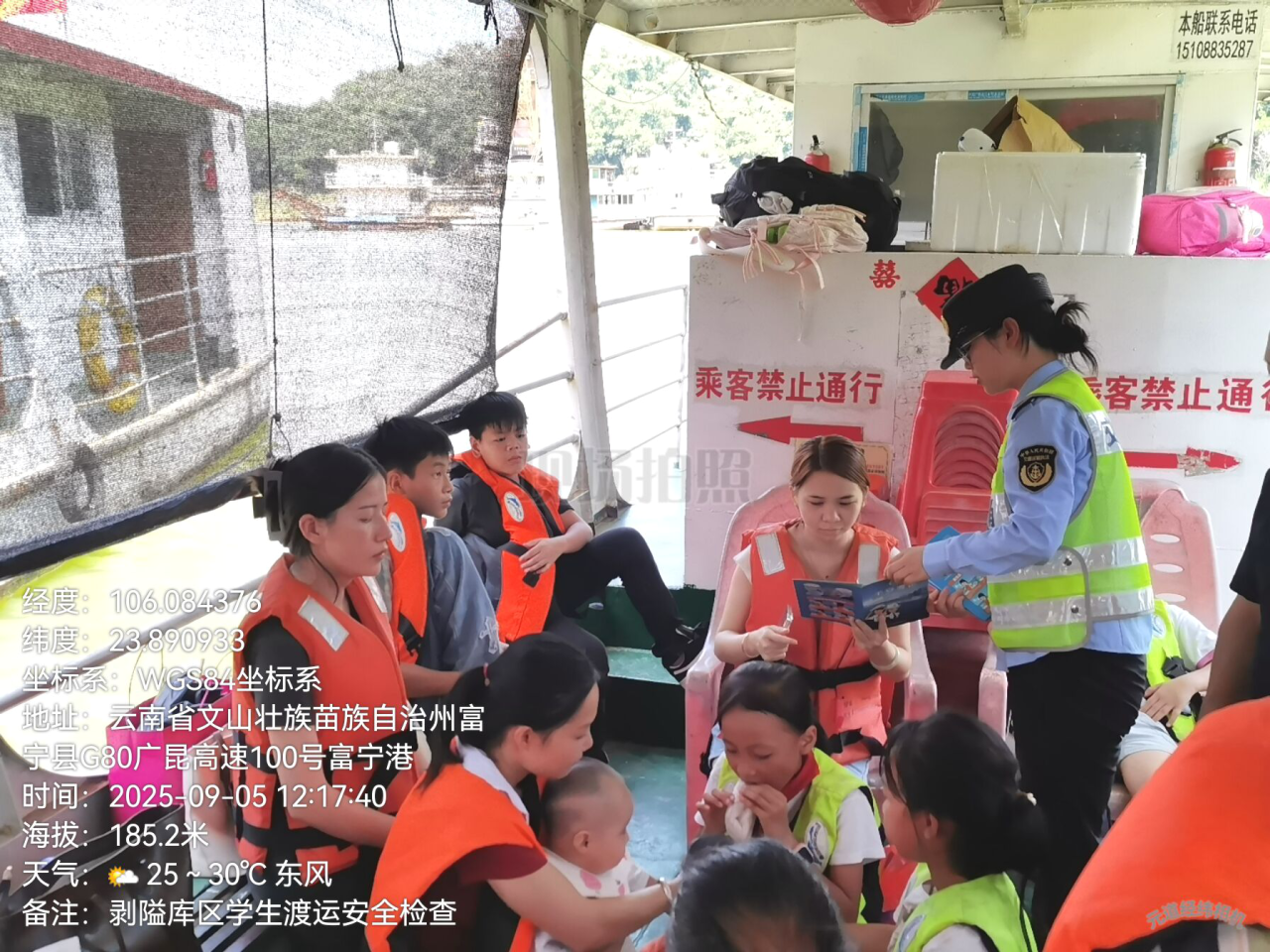 库区安全员:每个渡口配备富宁大队、属地派出所、乡镇工作人员各2名,检查学生救生衣穿戴情况、维护上下船秩序,同时记录天气、水位等影响渡运安全的因素。
