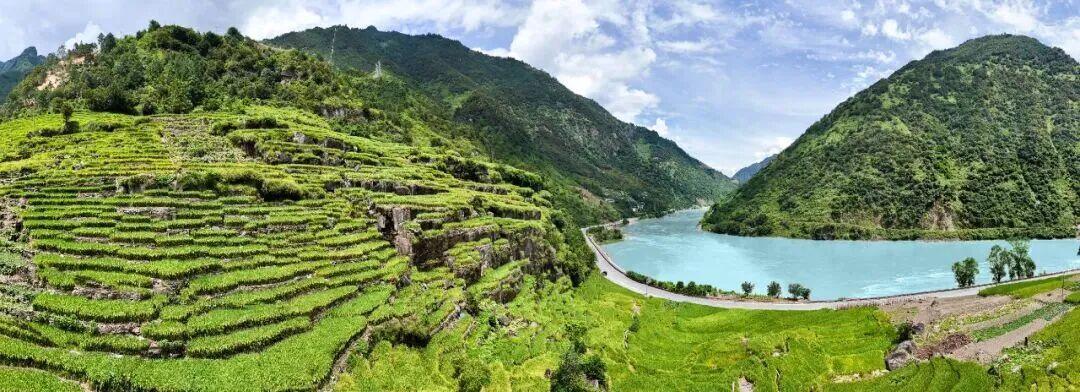 公路、梯田、绿水相得益彰