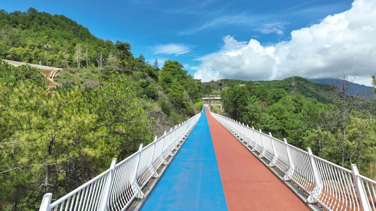 以“生态修复”“人文共生”为核心设计理念,长水至拉市公路丽江绿道部分通过科学规划与精细布局,系统性修复与优化区域生态环境。同时,深度融入当地人文元素,为公众提供高品质的出行体验。绿道全长10.7公里,宽4米,设计过程中严格遵循交通工程规范,路线依山就势蜿蜒延伸。针对路段陡峭高差问题,设计团队摒弃传统“削峰填谷”的粗放式干预,而创新设计一座螺旋桥于山涧盘旋而上,既巧妙化解了地形高差难题,又最大程度保留原始山体完整性,使绿道与山体自然肌理无缝融合。