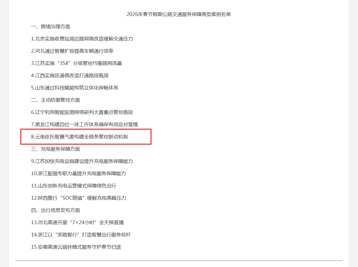 近日,交通运输部办公厅印发《2026年春节假期公路交通服务保障典型案例名单的通知》,涵盖拥堵治理、主动防御管控、充电服务保障、出行信息发布四个方面。其中,云南1个案例入选主动防御管控方面典型案例。